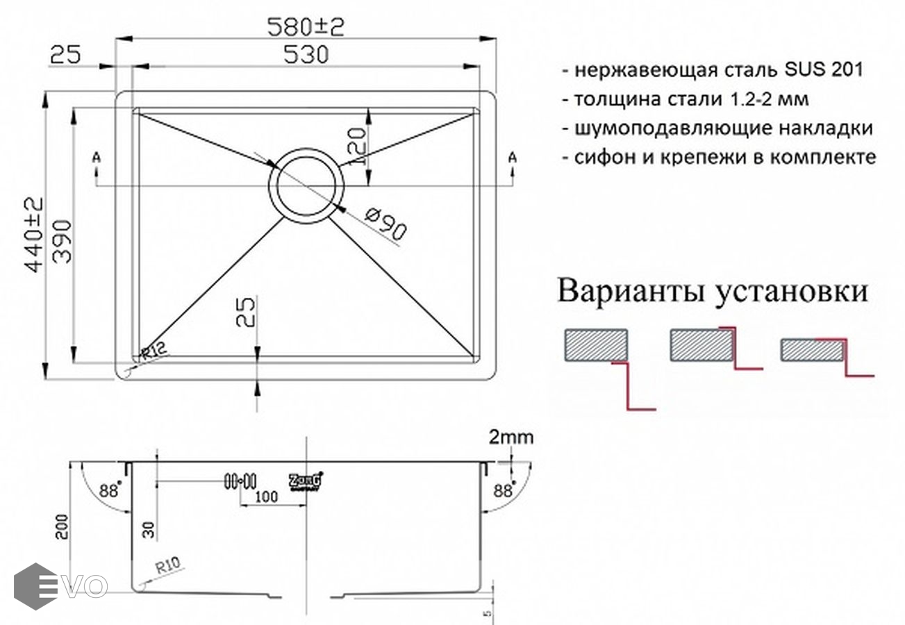 - толщина мойки 1,2 мм (бортик мойки 2 мм)