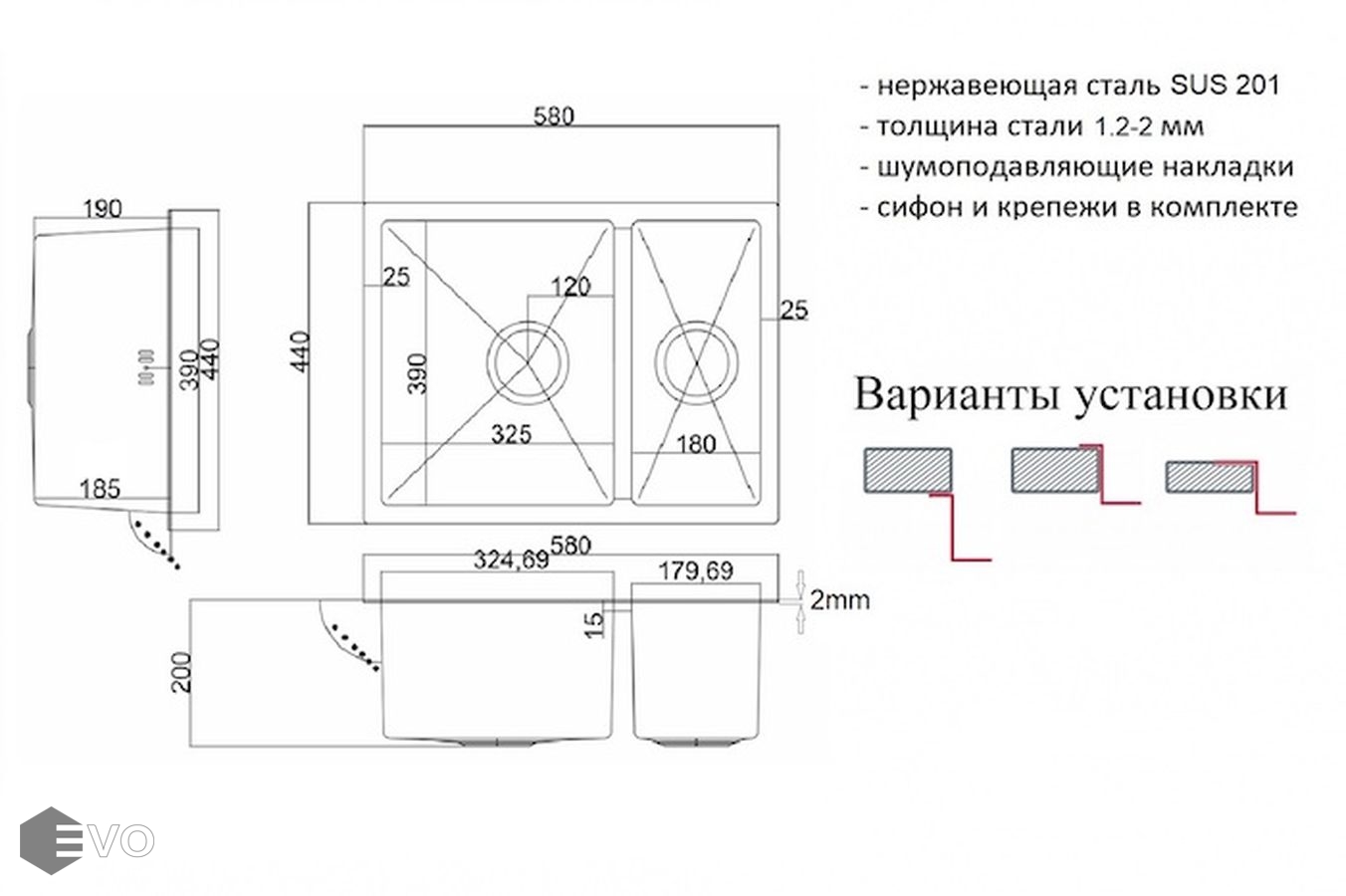 ВАЖНО! Возможны три варианта установки мойки: сверху на столешницу, снизу под столешницу, вровень со столешницей.