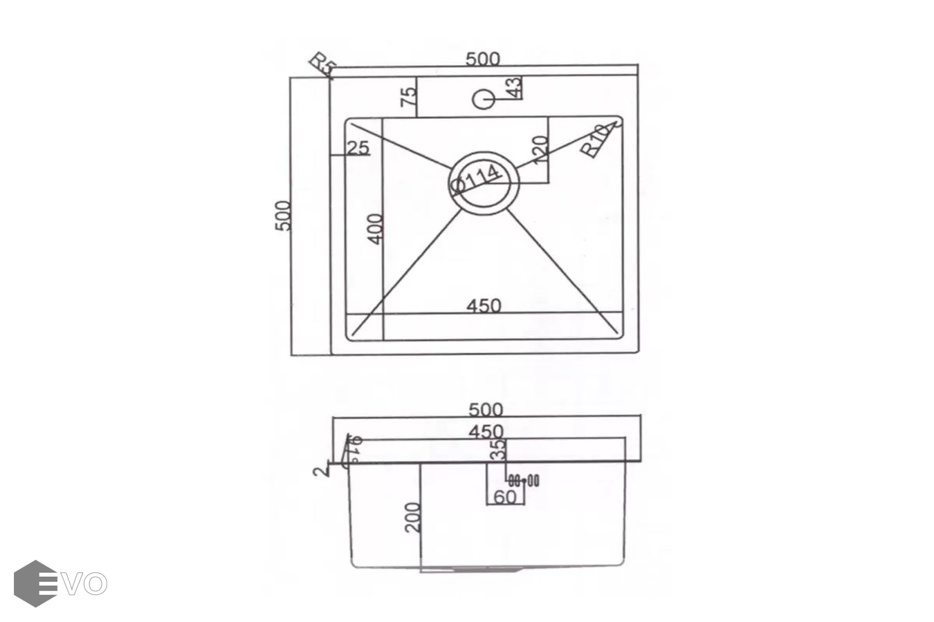 Оснащена удобным бортом, толщиной 2 мм, с двумя отверстиями - под смеситель и встраиваемый дозатор. С нижней стороны и по бокам предусмотрены шумопоглощающие накладки. Имеет R5 радиус закругления с внешней стороны. Внутренние углы с R10 радиусом закругления.