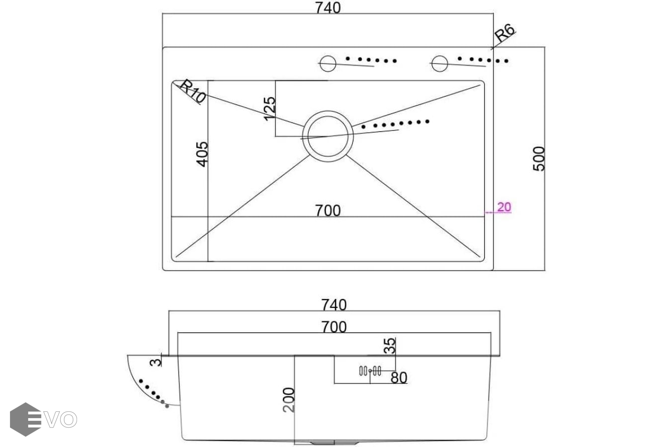 Имеет R5 радиус закругления с внешней стороны. Внутренние углы с R10 радиусом закругления.