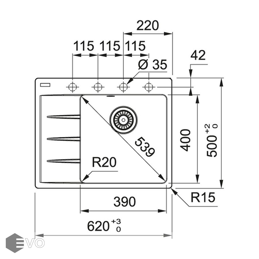 Мойка из запатентованного материала FRAGRANITE®, врезная на столешницу/врезная в уровень со столешницей, прямоугольная с переливом, чаша слева, вентиль-автомат.