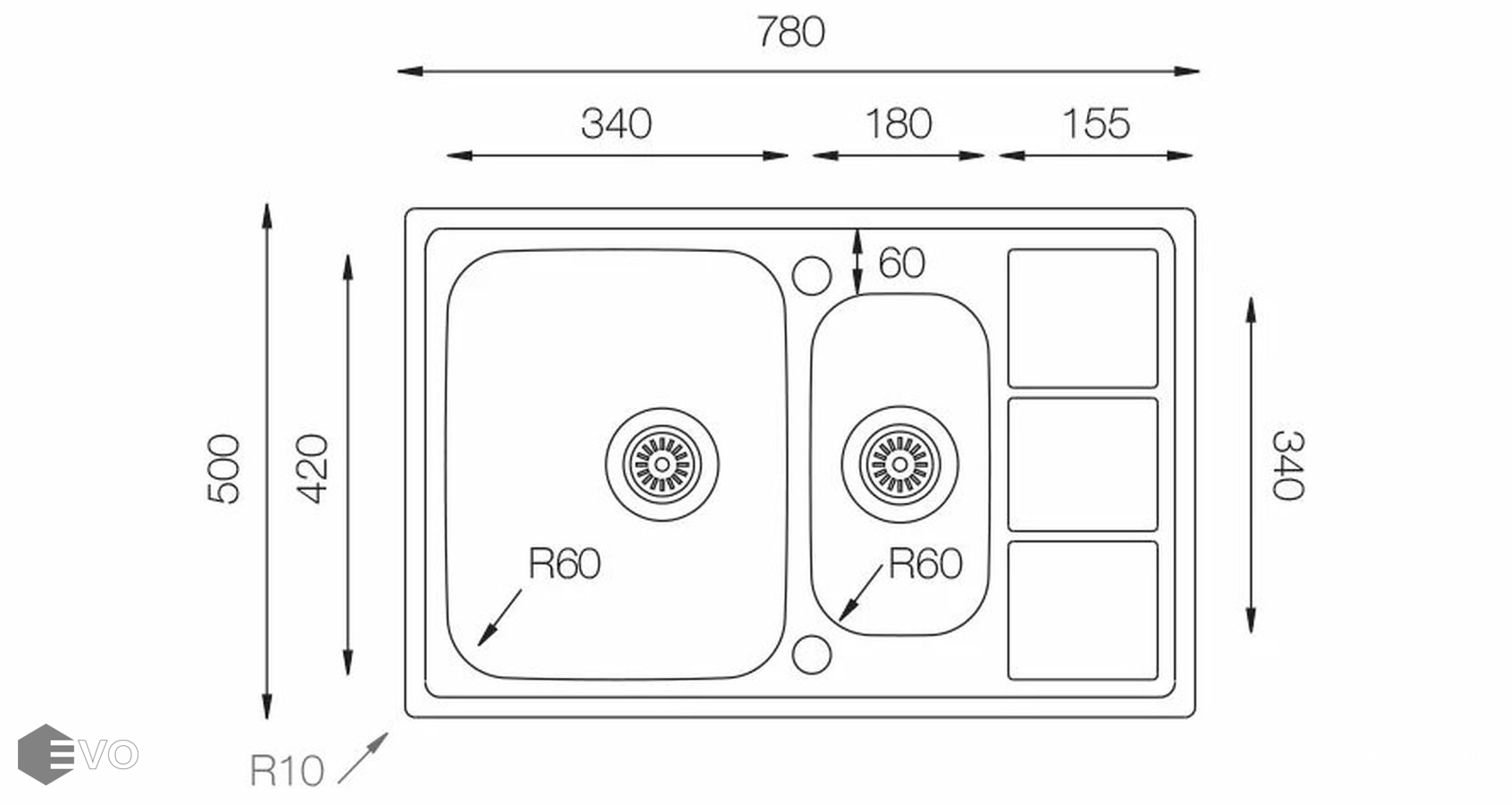 - Форма: Прямоугольная 2 чаши + крыло