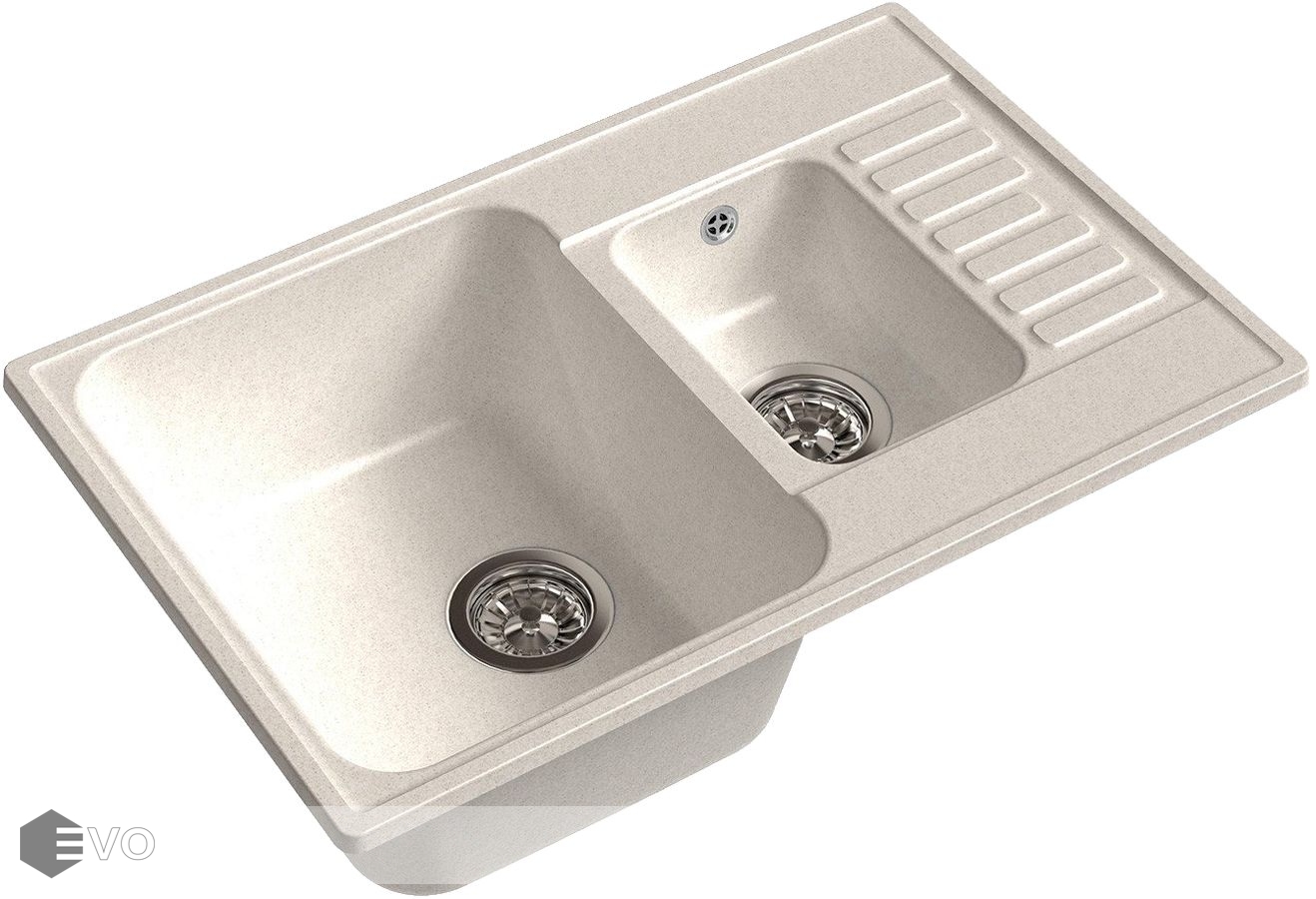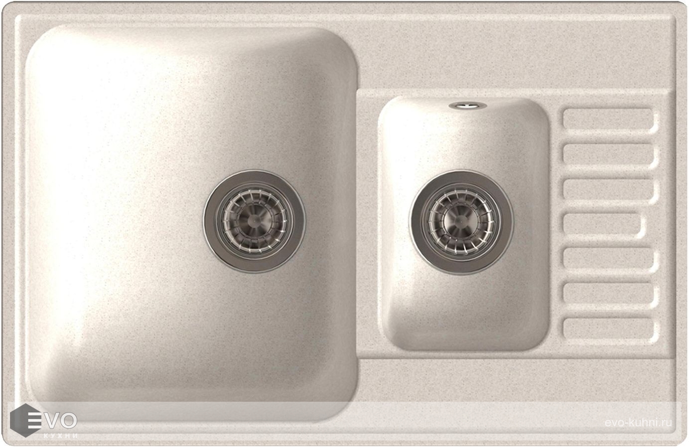Элегантная кухонная мойка белого цвета предназначена для врезки в столешницу, размеры изделия (ВxШxГ): 18x74x48 см. Модель с двумя чашами (глубиной 18 и 12 см) очень удобна в эксплуатации: она позволяет делать несколько операций одновременно, например мыть посуду и размораживать продукты. Оборачиваемая мойка во время установки может быть обращена крылом влево или вправо (в зависимости от варианта монтажа высверливается отверстие для смесителя). В комплекте поставляются выпуск с переливом и гофрированная трубка, а также резиновые уплотнители, диаметр слива — 9 см.