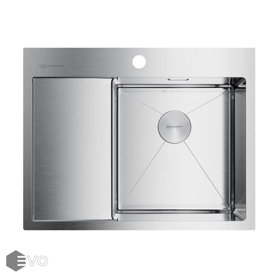 Современная и практичная мойка, произведенная вручную из японской высококачественной хромоникелевой нержавеющей стали OMOIKIRI Akisame 65-IN-R с плоским кантом доступна для врезного монтажа и монтажа вровень со столешницей.