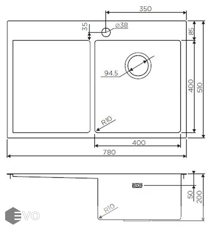 Размер основной чаши мойки: 400x400 мм
