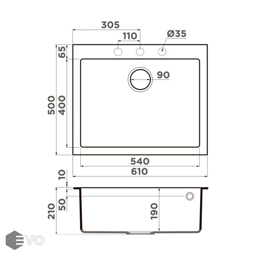 • Размер мойки 610x500