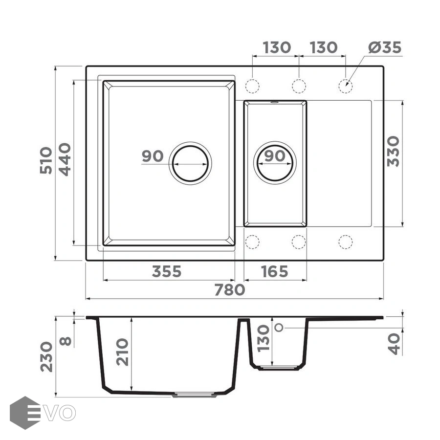 - Глубина чаши, мм: 230 / 130
