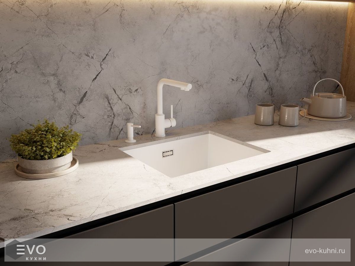 Мойка белого цвета создана из материала «Tetogranit Metal». В его составе: акриловая смола и натуральный гранит с добавлением металлических частиц, которые придают блеск и мерцание поверхности мойки. «Tetogranit Metal» отличается максимальной устойчивостью к температурным перепадам и ударам; Материал выдерживает высокие температуры до 280°С (но не стоит ставить на поверхность мойки горячие сковородки и кастрюли, т.к их температура может достигать 500°С).