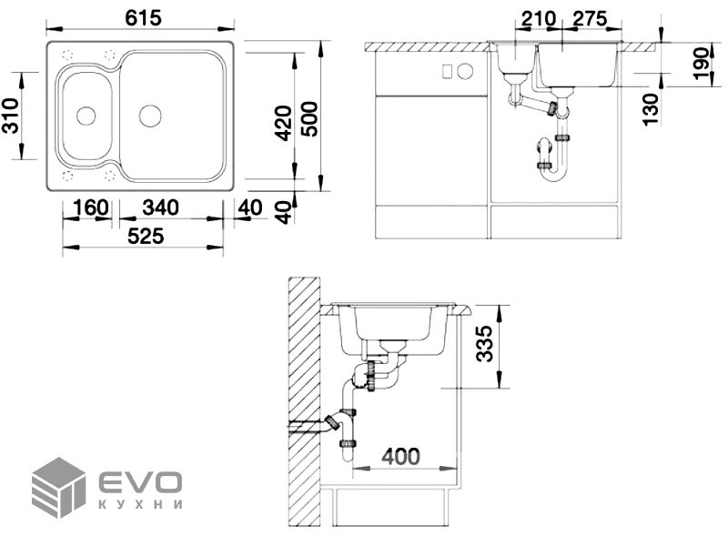 | от 600 мм | Учитывать ширину пристенного канта в случае установки мойки возле стены. |
