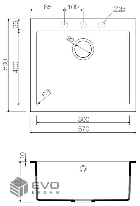 Размер мойки 570x500