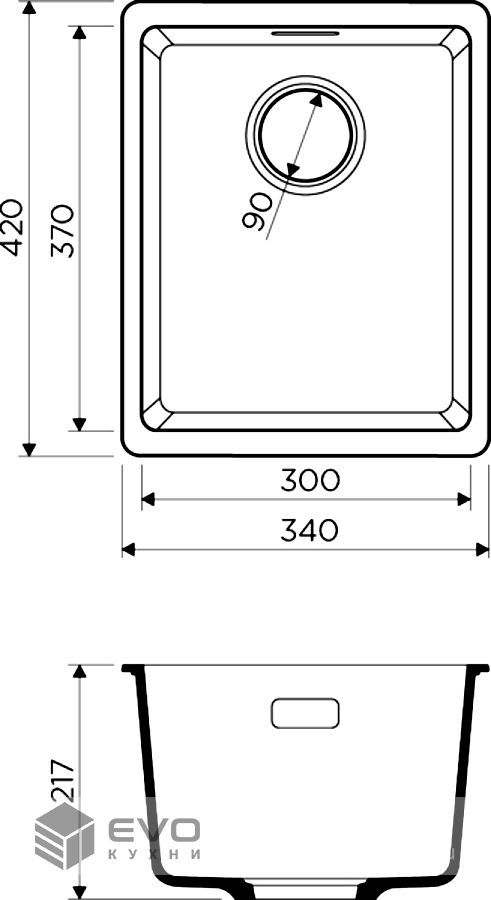 - Размер выреза под мойку: 300х370 мм., угловой радиус врезки 12 мм.