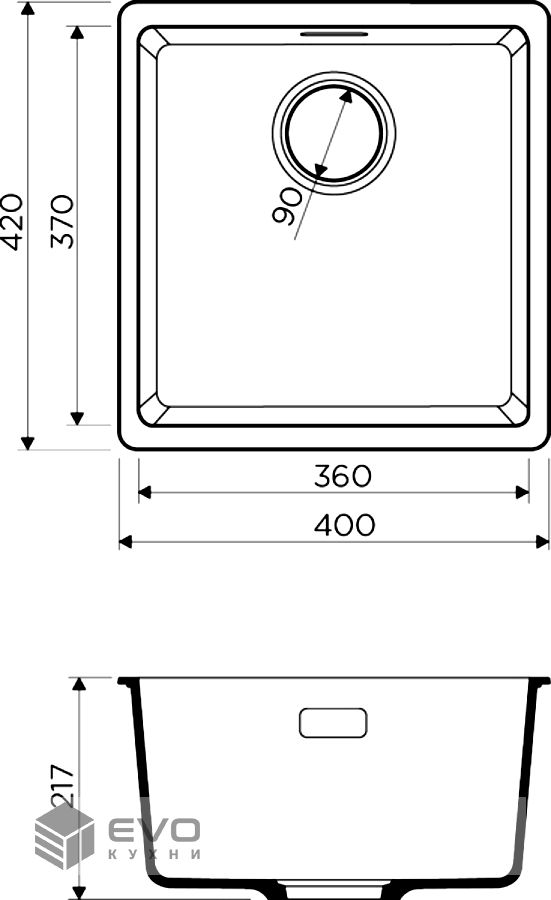 - Размер выреза под мойку: 360х370 мм., угловой радиус врезки 12 мм.