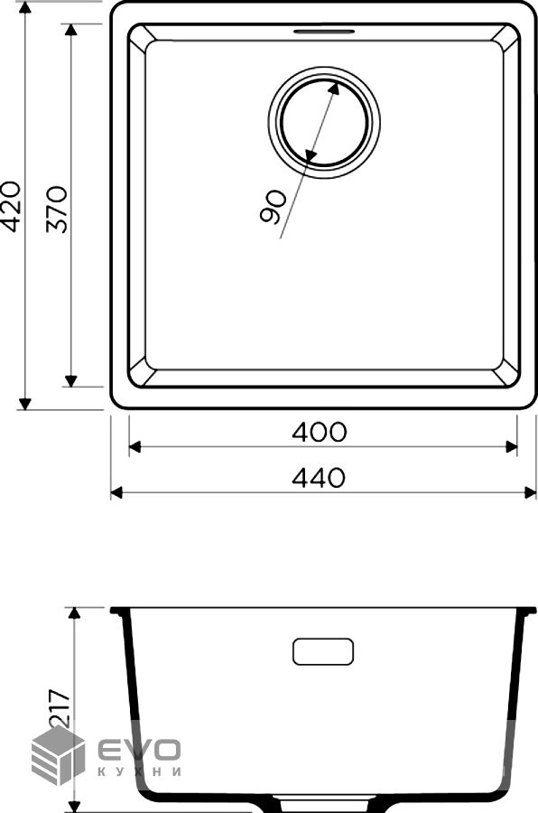 - Размер выреза под мойку: 400х370 мм., угловой радиус врезки 12 мм.