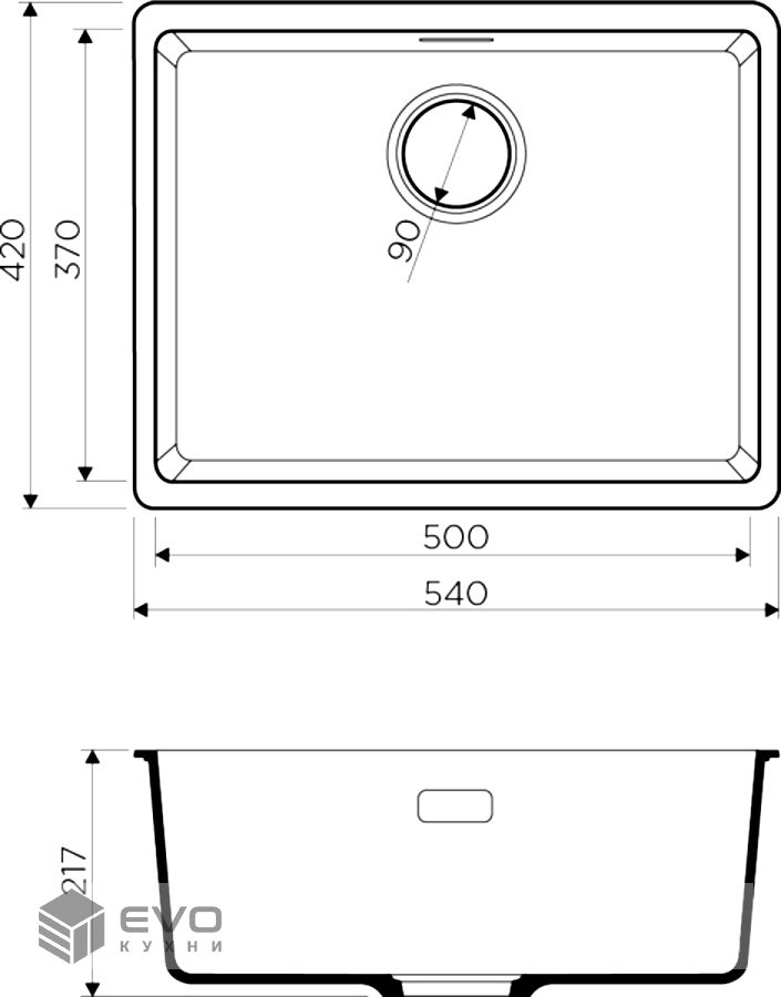 • Размер выреза под мойку: 500х370 мм., угловой радиус врезки 12 мм.