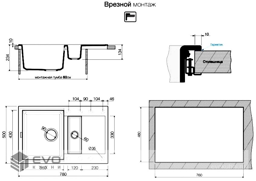 | Размер мойки | 780х500 |