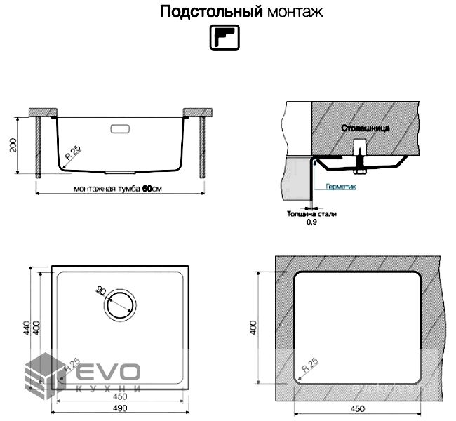 Размер мойки 490х440