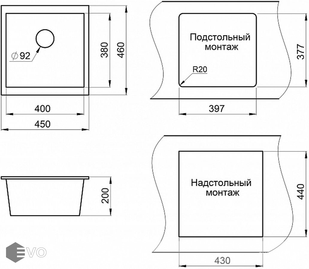Возможна установка как над, так и под столешницей.