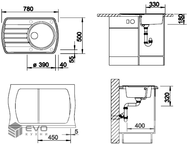 | Сверху на столешницу | Мойка устанавливается сверху в предварительно подготовленный вырез в столешнице. |