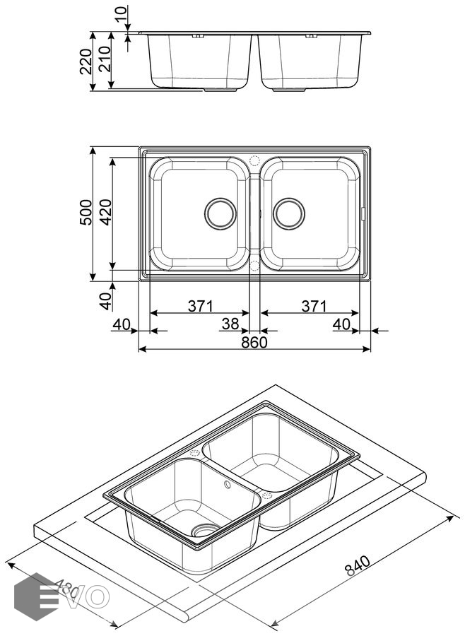 - Размеры выреза в столешнице (мм) 840x480