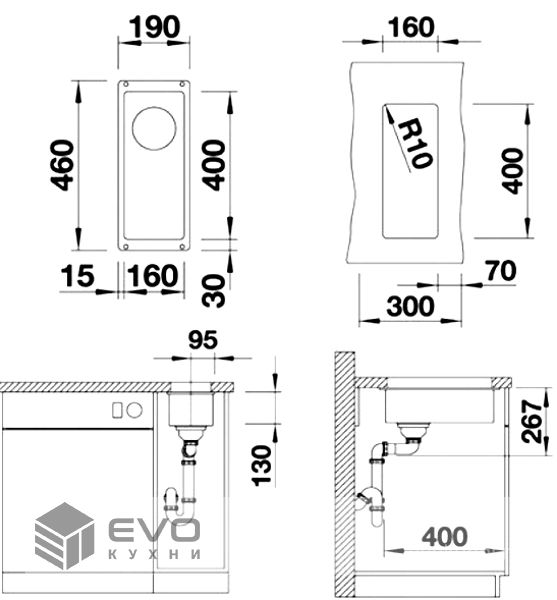 | Под столешницу | Мойка устанавливается под столешницу в предварительно подготовленный вырез. |