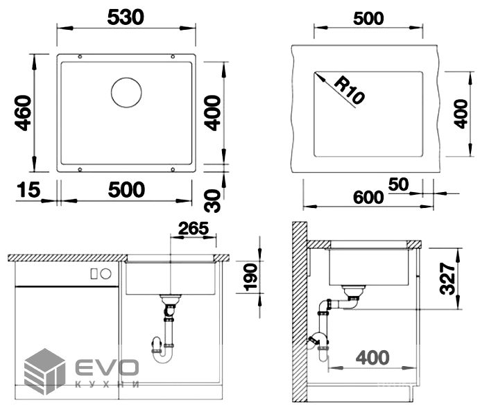 | Под столешницу | Мойка устанавливается под столешницу в предварительно подготовленный вырез. |