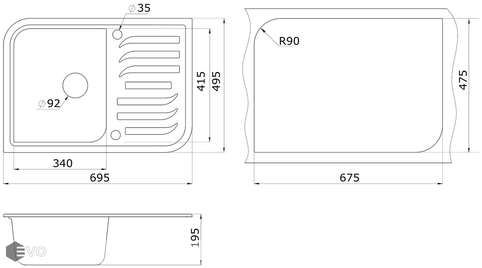 - Ширина мойки 69.5 см