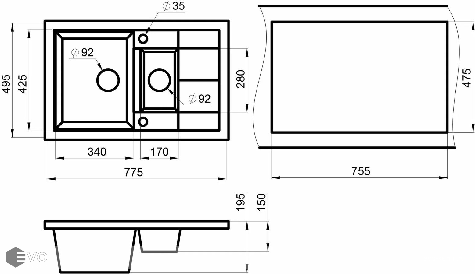 - Особенности дополнительная чаша, отверстие под смеситель, клапан-автомат
