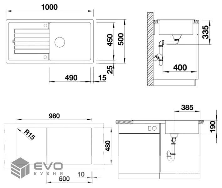 | от 600 мм | Учитывать ширину пристенного канта в случае установки мойки возле стены. |