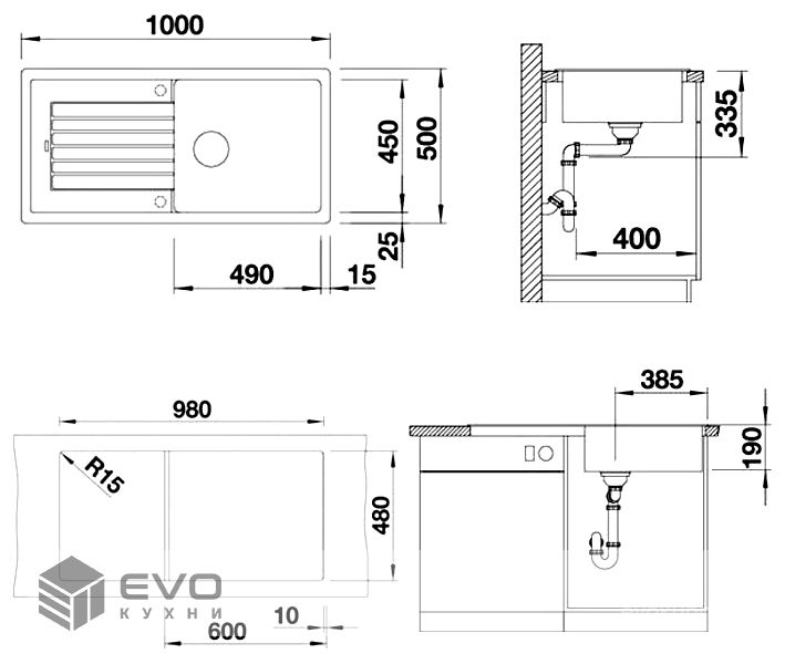 | от 600 мм | Учитывать ширину пристенного канта в случае установки мойки возле стены. |
