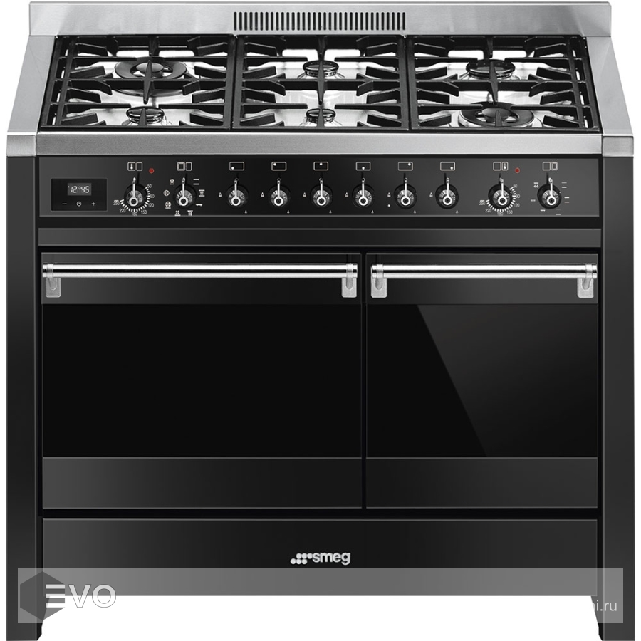 Варочный центр SMEG A2BL-81 — отдельно стоящая модель с газовой поверхностью и электрическими духовками, оснащен дисплеем сенсорного управления, имеет выдвижной ящик и поворотные переключатели. Этот вариант удобен для кухонь небольших заведений, духовка разделена на 2 отдела для раздельного приготовления большого объема блюд. На варочной панели расположено 6 горелок разной мощности, каждая с защитой от утечки газа. Чугунные прочные решетки рассчитаны на большие нагрузки.