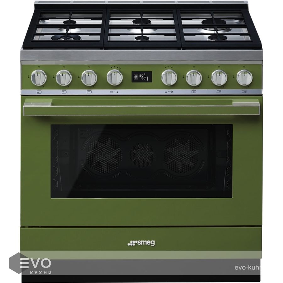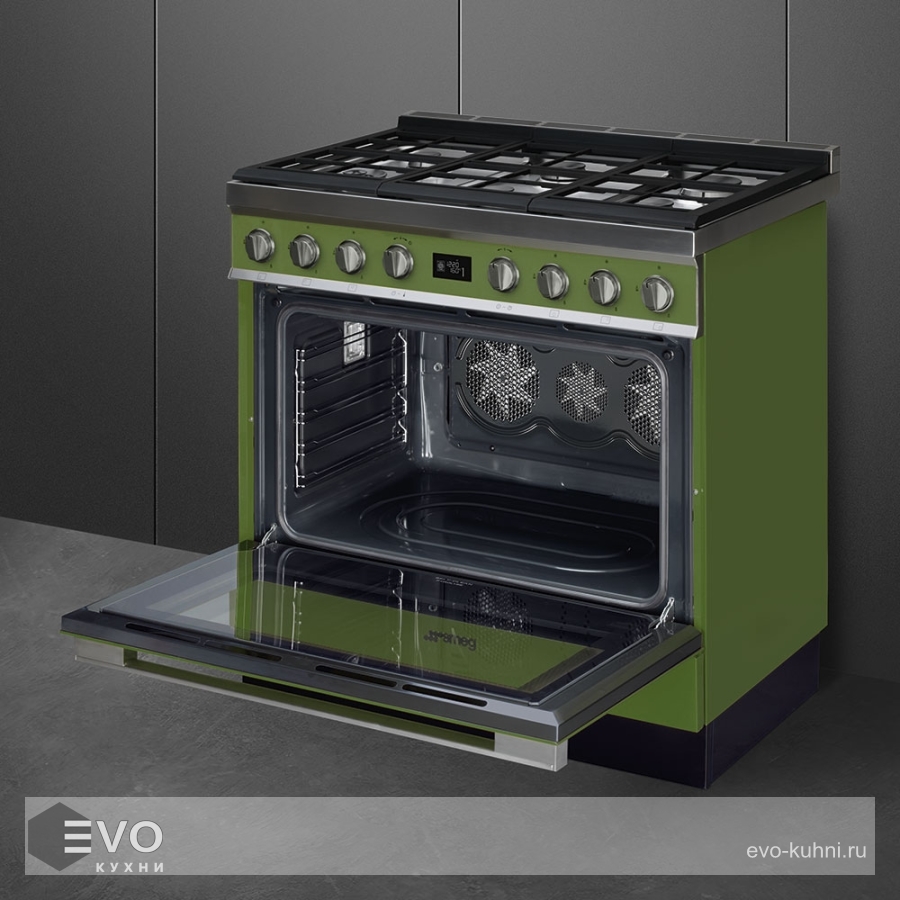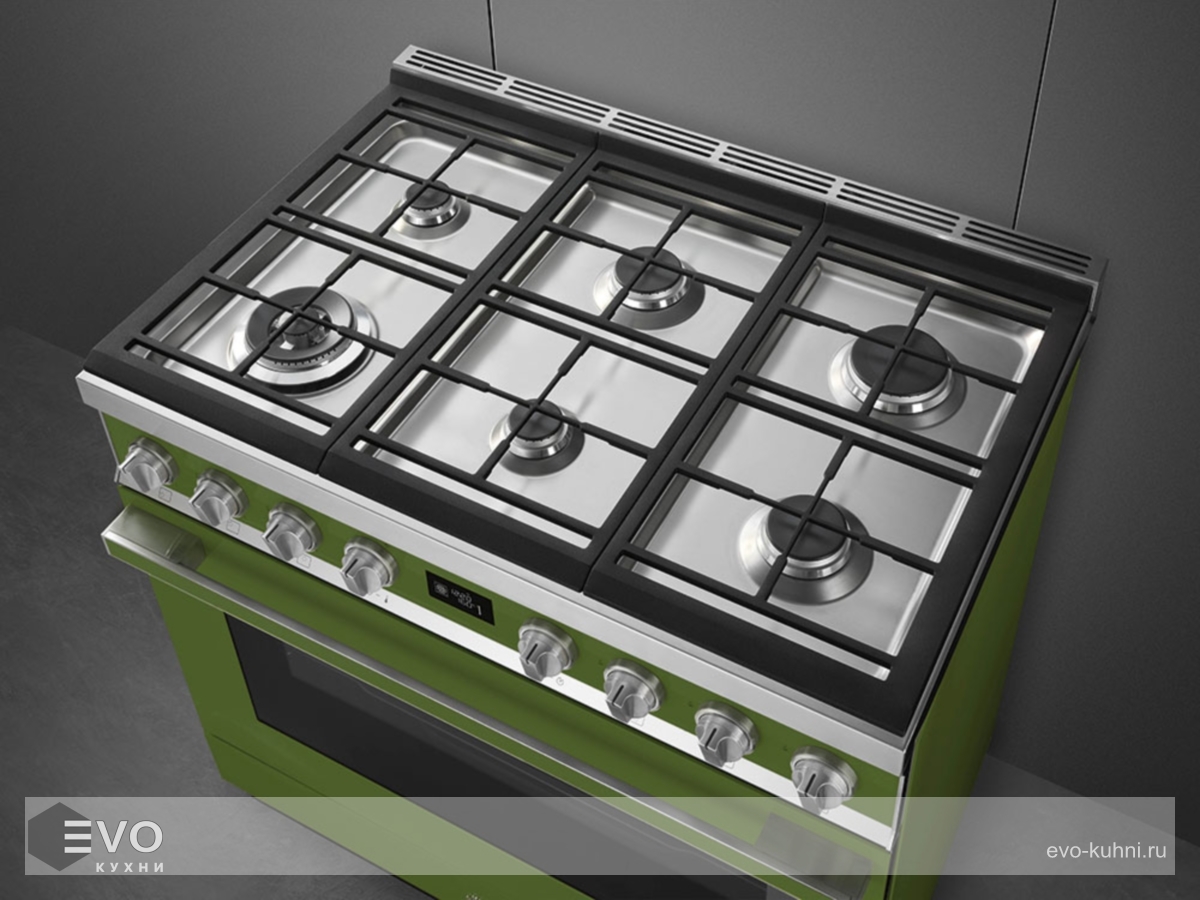 Плита кухонная Smeg CPF9GPOG – плита с системой закрывания Soft Close, комбинированный вариант газовой поверхности и электрического духового шкафа. Эта модель многофункциональна – на поверхности расположены 6 горелок разного размера и мощности с электроподжигом и контролем утечки газа.