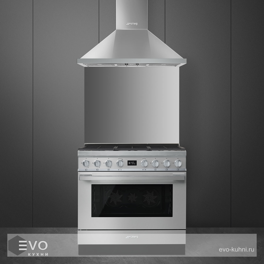 Плита кухонная Smeg CPF9GPX – плита с системой закрывания Soft Close, комбинированный вариант газовой поверхности и электрического духового шкафа. Эта модель многофункциональна – на поверхности расположены 6 горелок разного размера и мощности с электроподжигом и контролем утечки газа.