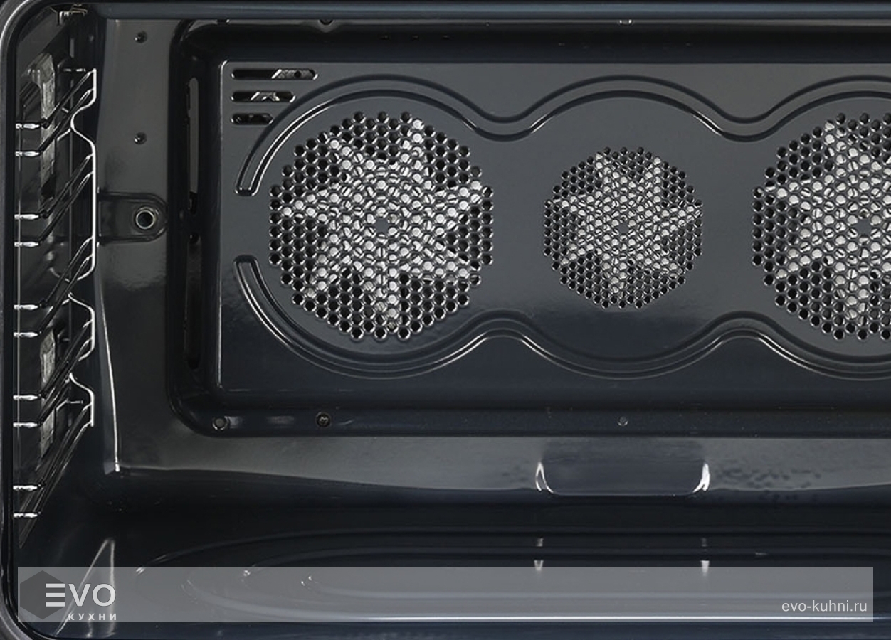 В духовке встроены вертел, гриль, вентилятор для конвекции, в комплекте поставляются противни и решетки. Предусмотрен таймер, в программах заложена разморозка по весу и времени, поднятие теста, подогрев блюд. В меню владельцу предложены автоматические программы приготовления, температура регулируется в диапазоне +50 - +260°С. Можно сочетать работу вентилятора, тена, гриля, внутренняя камера очищается пиролизным способом (нагрев и разложение жировых отложений).