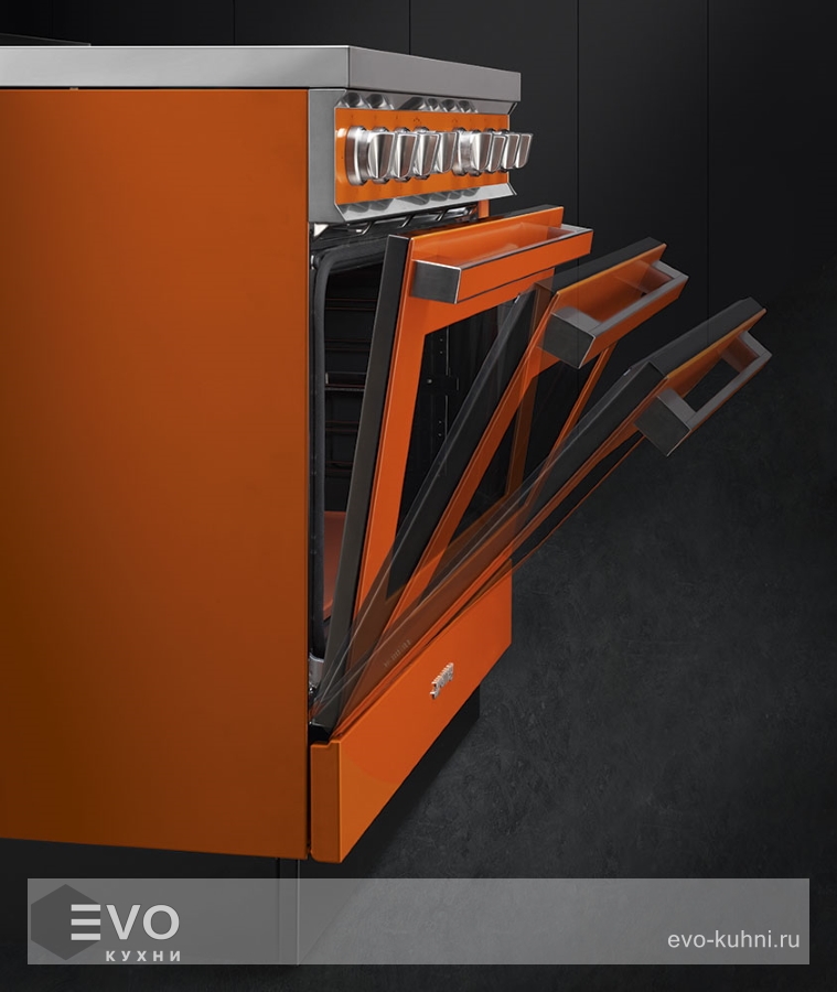 Плита кухонная Smeg CPF9IPOR – плита включает в себя индукционную варочную поверхность из стеклокерамики с 5-ю конфорками, функцией Booster для увеличения мощности и духовой шкаф объемом 115 литров с 5 уровнями приготовления, оснащена системой плавного закрывания Soft Close.