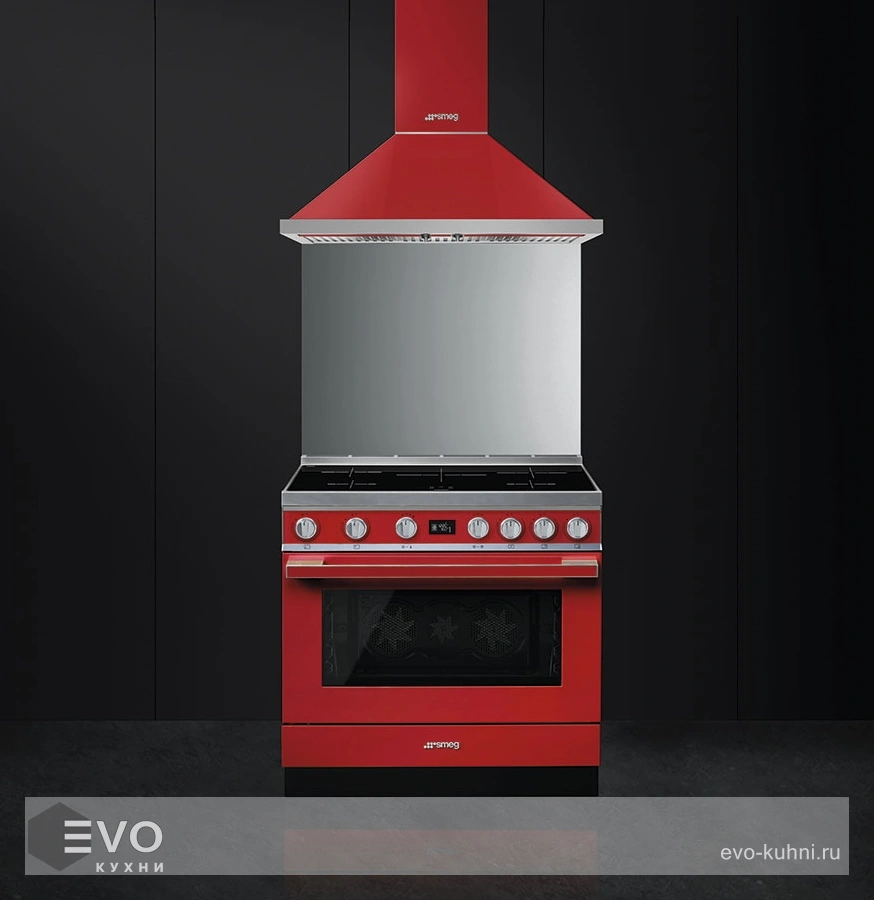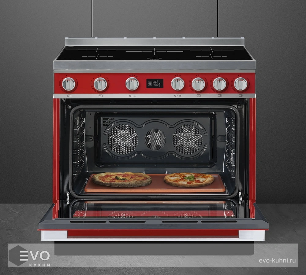 Плита кухонная Smeg CPF9IPR – плита включает в себя индукционную варочную поверхность из стеклокерамики с 5-ю конфорками, функцией Booster для увеличения мощности и духовой шкаф объемом 115 литров с 5 уровнями приготовления, оснащена системой плавного закрывания Soft Close.
