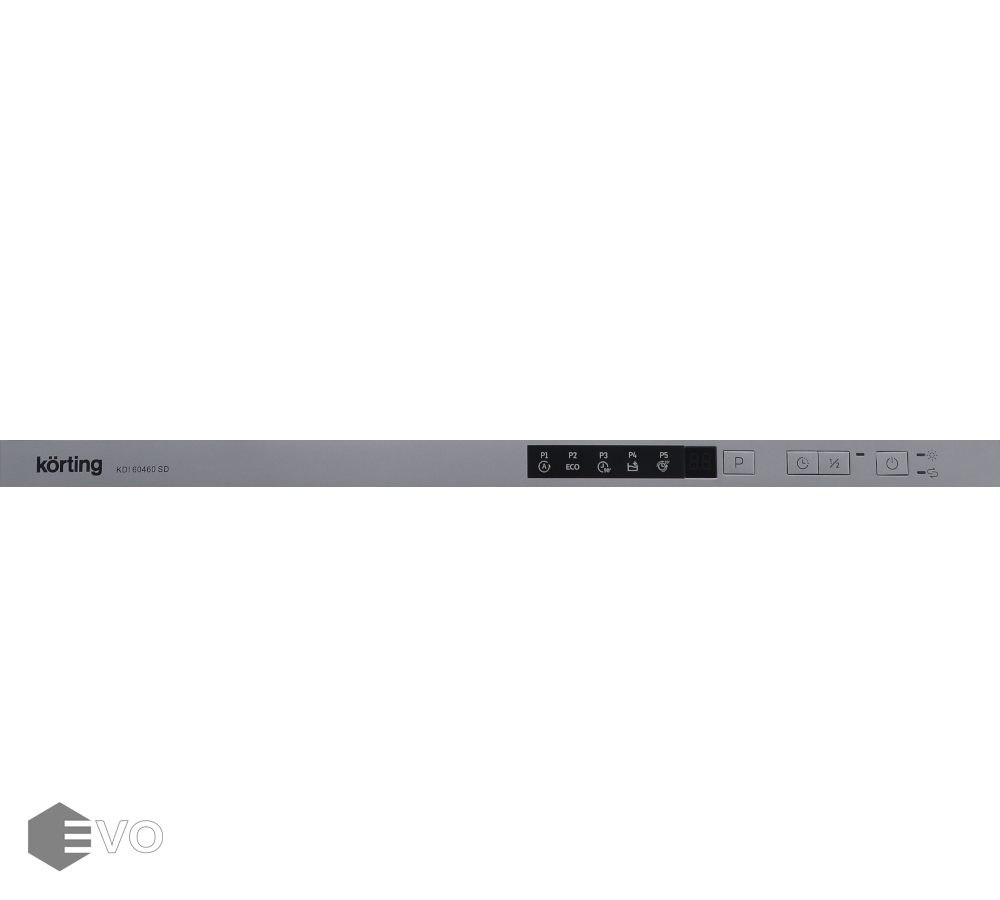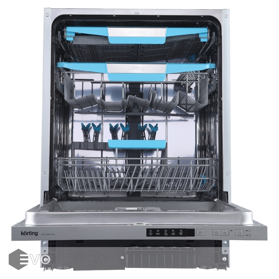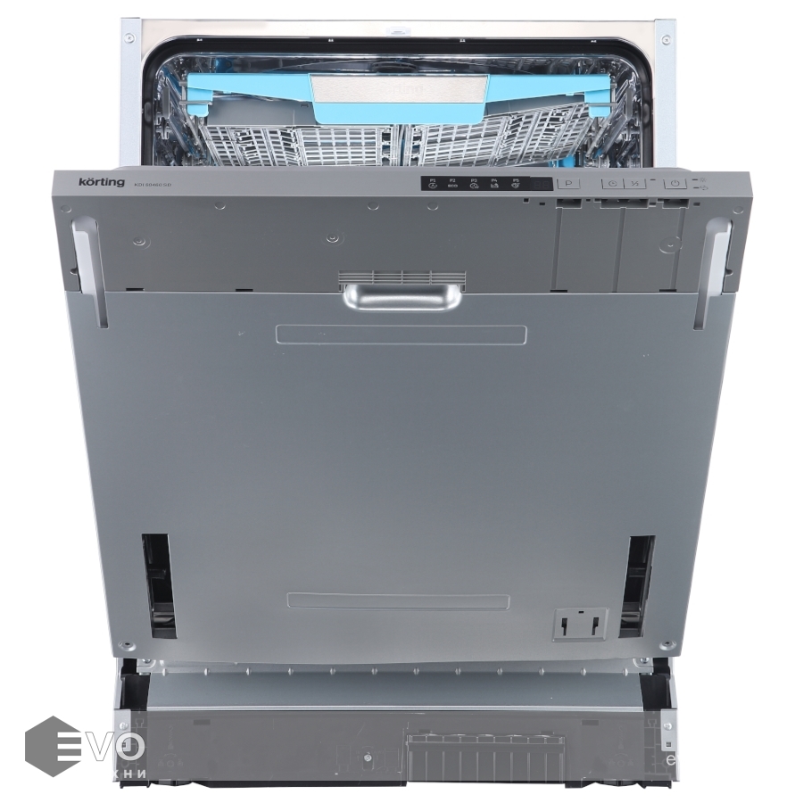 Посудомоечная машина Korting KDI 60460 SD — встраиваемая модель шириной 60 см. Важное отличие — слайдерное крепление двери, которая движется на скользящих направляющих и не задевает нижний цоколь, даже если фасад достигает 80 см.