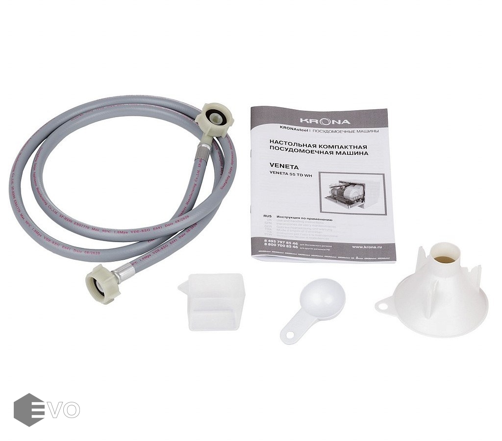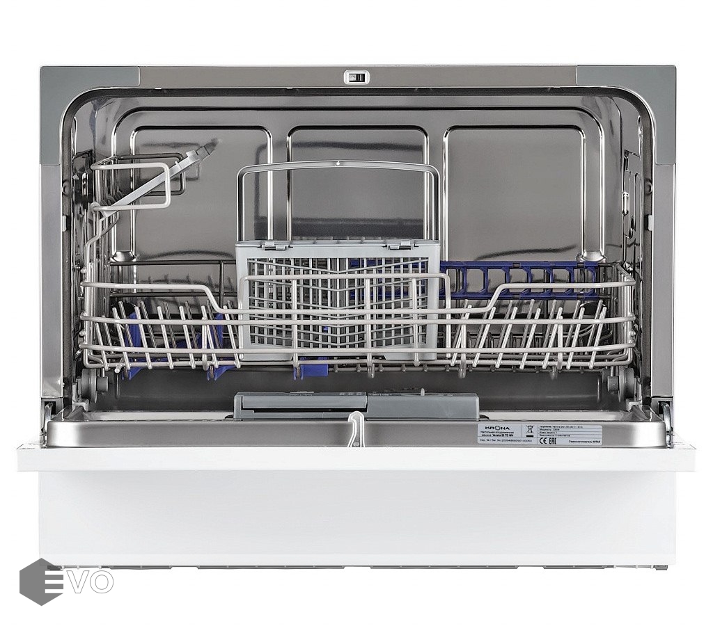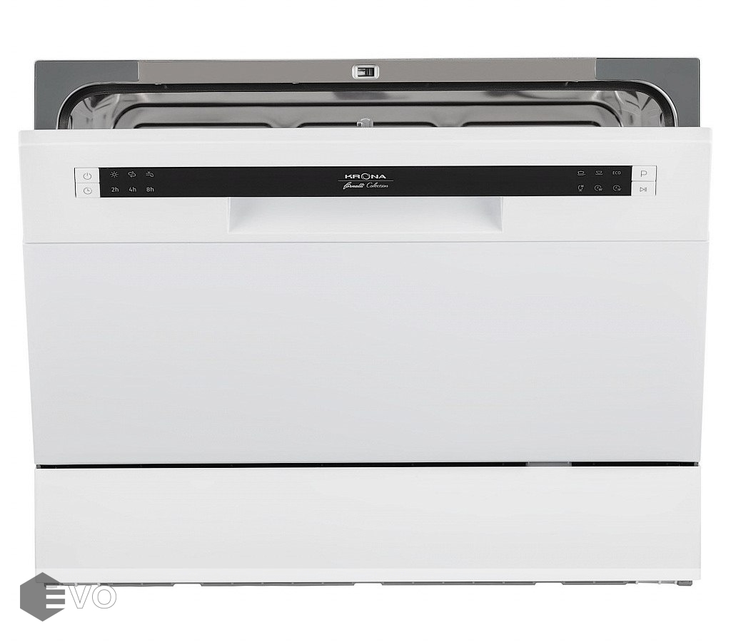 Настольная посудомоечная машина KRONA VENETA 55 TD WH – машина шириной 55 см вмещает 6 комплектов посуды. Несмотря на компактный размер VENETA 55 TD не уступает по функциям полноразмерным посудомоечным машинам: 6 программ мойки для любого случая загрязнений, таймер отложенного старта. Благодаря компактному размеру посудомоечная машина экономно расходует воду и электроэнергию. Модель отлично подойдет для семей до 3х человек. Также есть таймер отложенного старта на 2/4/8 часов и звуковой сигнал окончания хода программы.