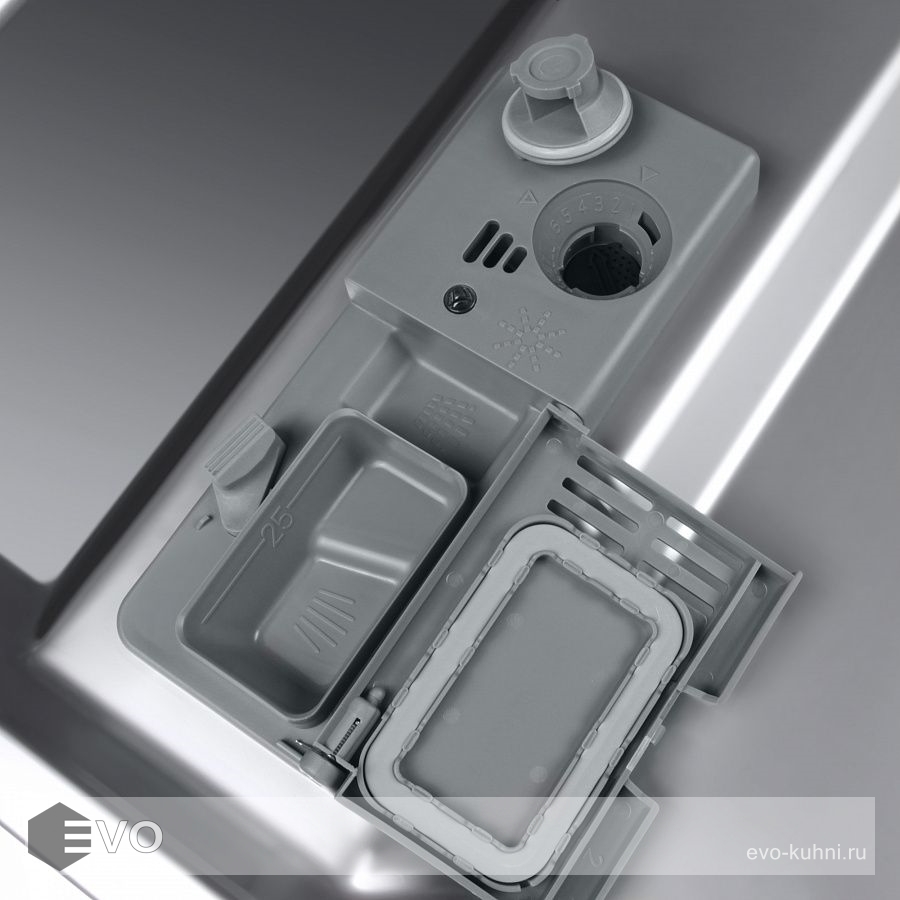 Электронное управление с дисплеем расположено в торце загрузочной дверцы. Функционал данной модели позволяет вам: выбрать программу мойки, активировать функцию экстра-сушки, включить половинную загрузку, которая позволяет выбрать для мытья посуды либо верхнюю, либо нижнюю корзину выставить время отсрочки старта (1-24 часов).