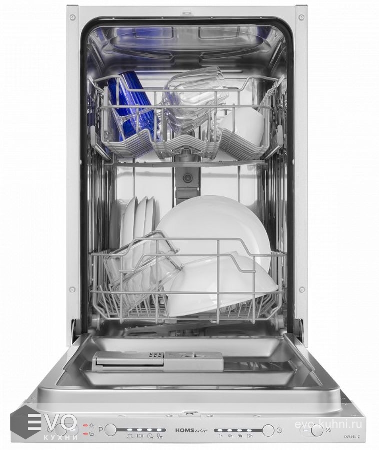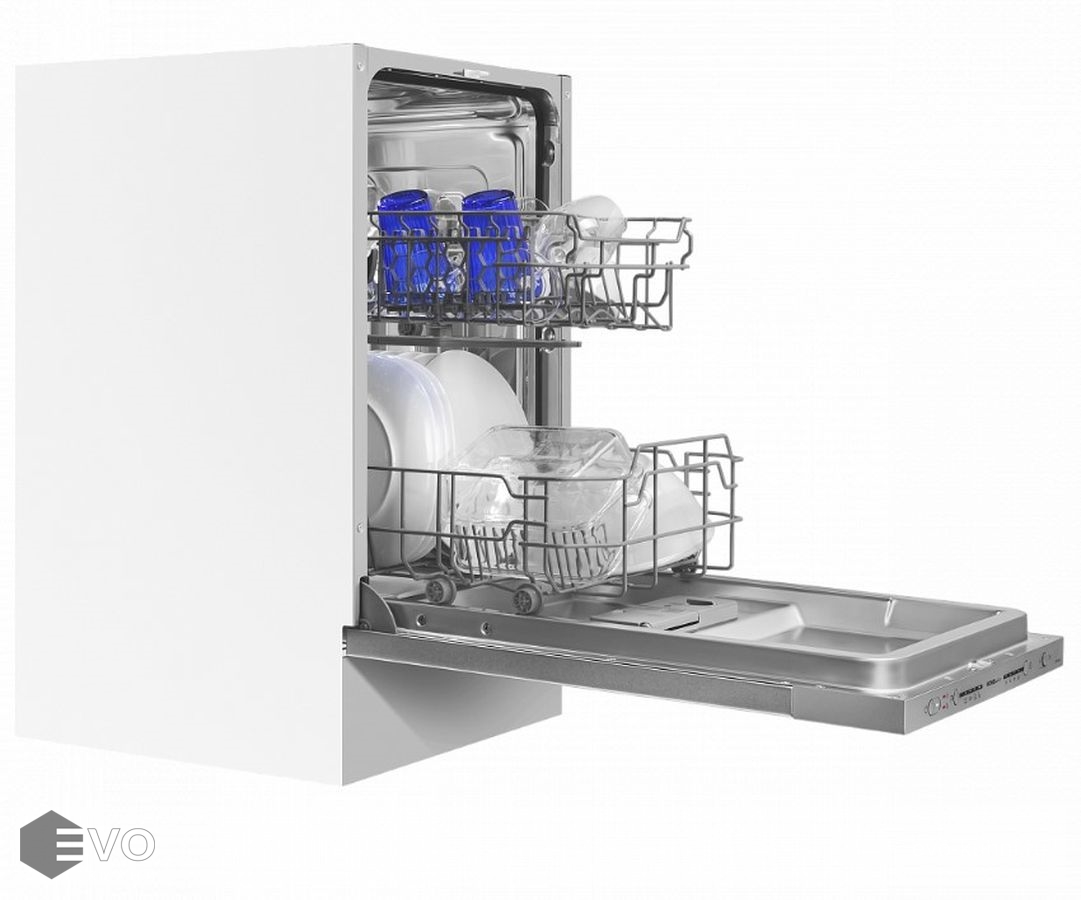 Узкая встраиваемая посудомоечная машина шириной 45 см. Высокая эффективность использования внутреннего пространства благодаря специальным корзинам.