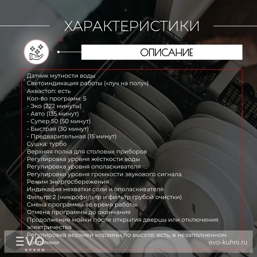 Функции : | Быстрая мойка Дисплей Лоток для столовых приборов Луч-индикатор на полу Отсрочка старта Половинная загрузка |