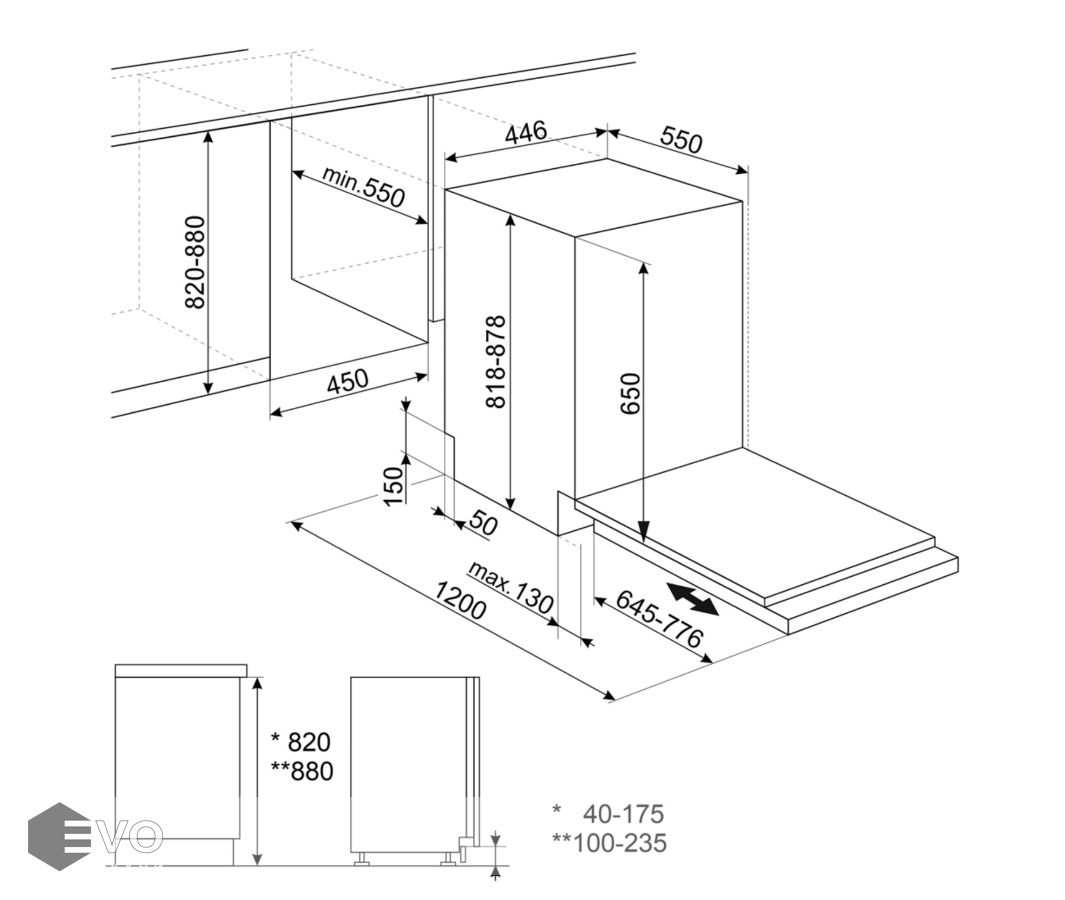 Размеры встраивания (ВхШхГ), мм: 820-880х450х550