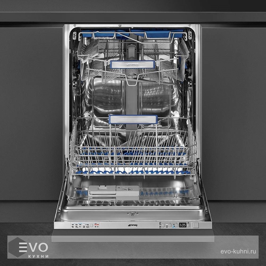 Посудомоечная машина Smeg ST 65336 L – встраиваемая модель шириной 60 см, рассчитанная на загрузку 13 полных комплектов. В меню предложено 10 рабочих режимов, можно отложить включение, выбрать температуру и с помощью опции FlexiZone выбрать половинную загрузку. Верхнюю корзину можно регулировать по высоте, наполнение корзин продумано до мелочей – отделение для столовых приборов, держатели для стекла, в нижнюю корзину удобно складывать крупногабаритную посуду. Прибор можно подключить к горячему водоснабжению, встроены фильтры очистки и смягчения воды. Орбитальная система разбрызгивания воды позволяет отмыть любую посуду до идеального блеска. Об окончании работы сообщит изменение цвета луча, спроектированного на пол.