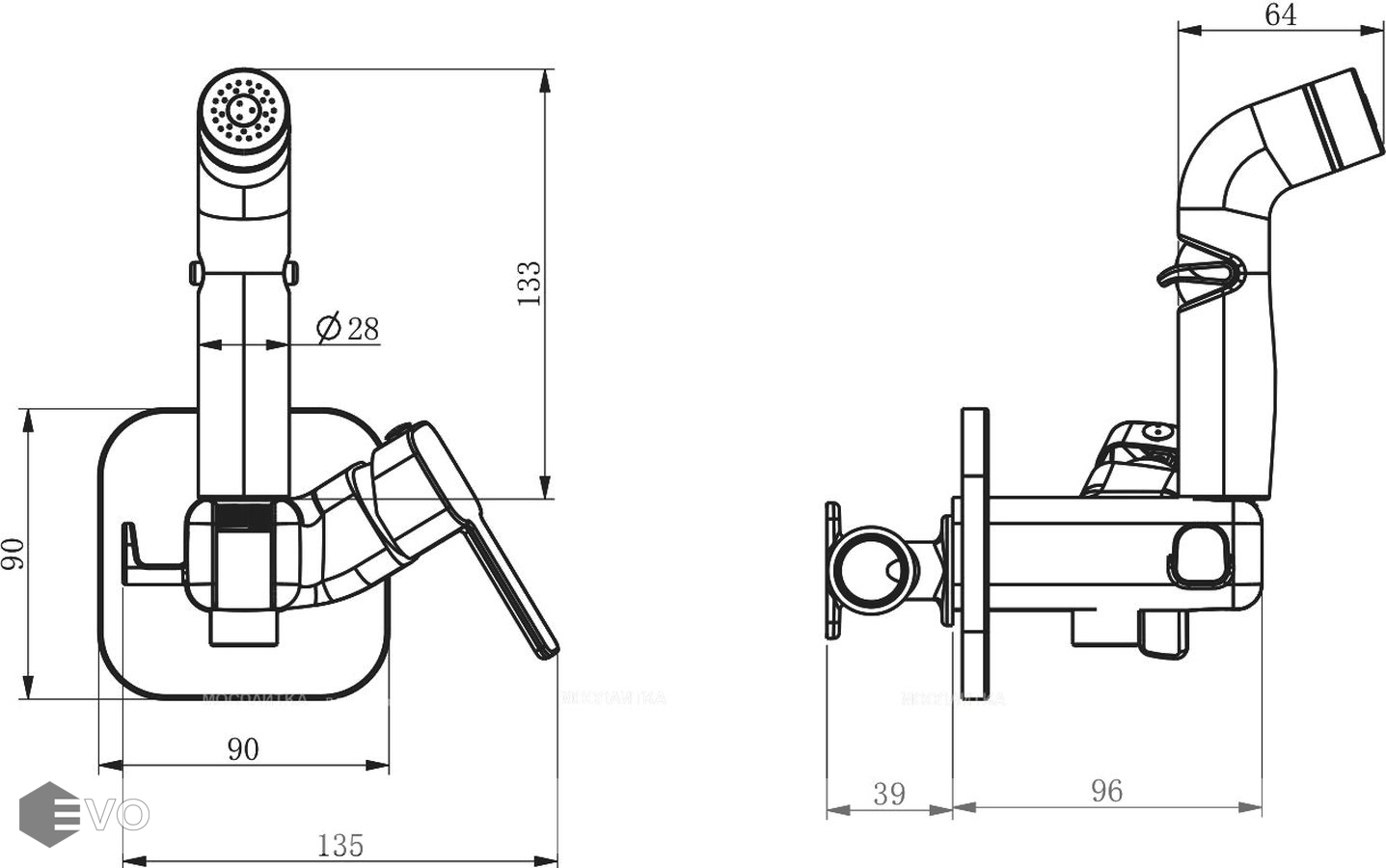 - Оснащение: Держатель для душа, Душевой шланг, Крючок, Смеситель