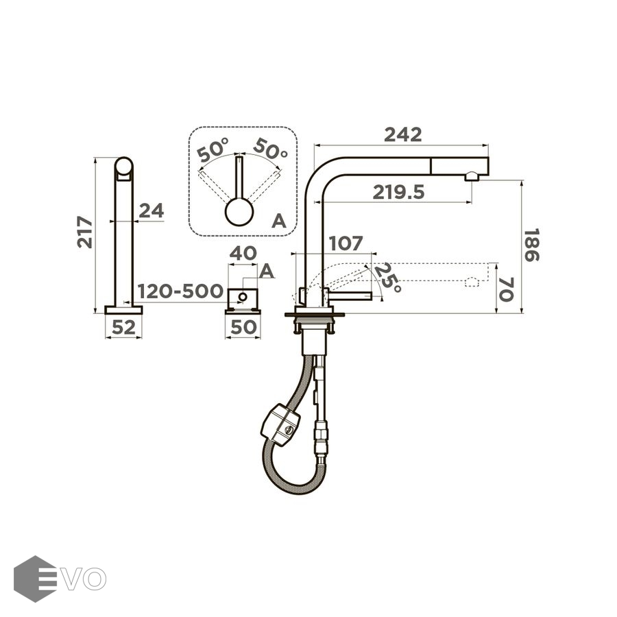 - Особенности: Вытяжной шланг до 400 мм, установка под окно, отдельный рычаг регулировки
