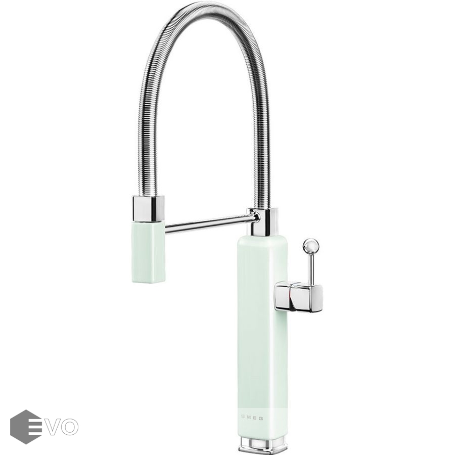 Однорычажный смеситель SMEG MDF50PG выполнен в пастельно-зеленом цвете.