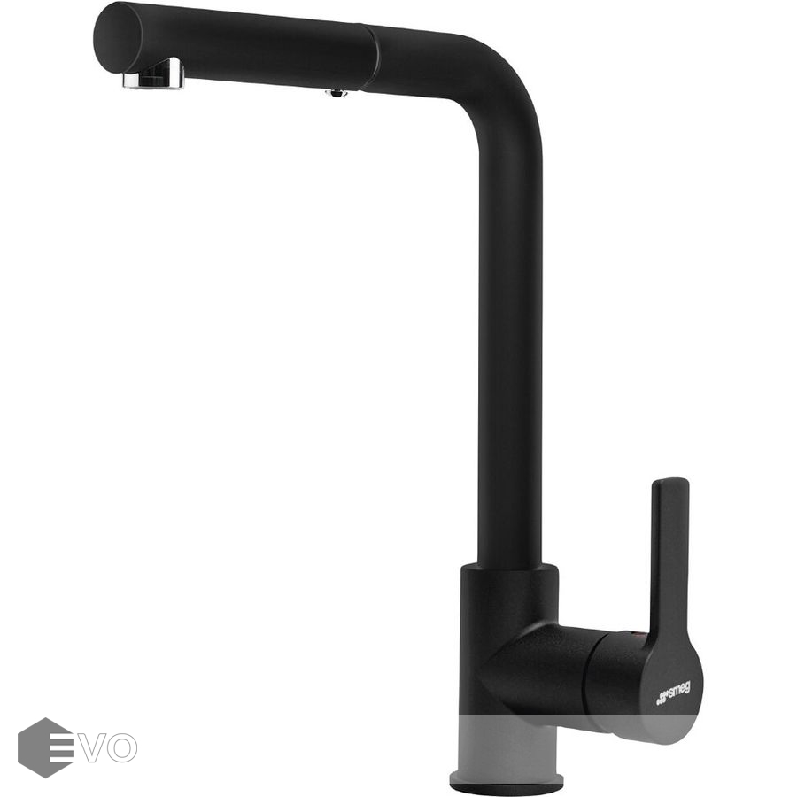 Однорычажный смеситель для кухни Smeg MID1MN черного матового цвета с поворотным и выдвижным изливом органично впишется с остальными приборами в современном интерьере.