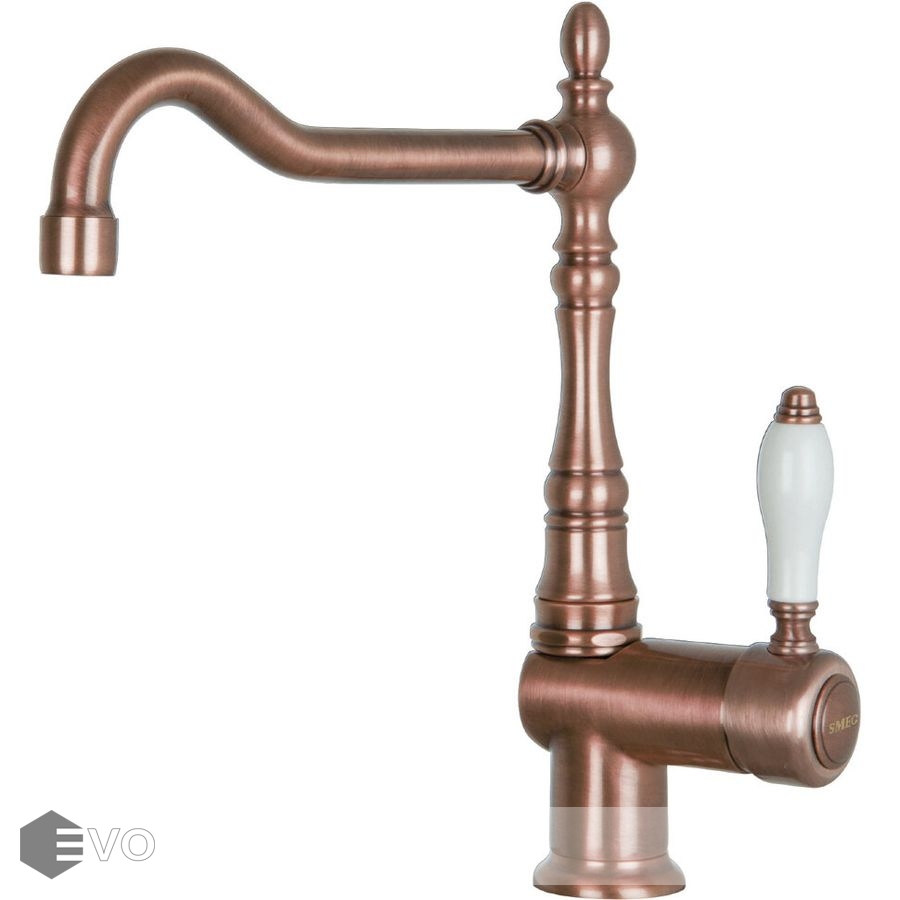Однорычажный смеситель для кухни Smeg MIR6RA-2 медного цвета с гибкой нейлоновой подводкой и поротным изливом органично впишется с остальными приборами в современном интерьере.