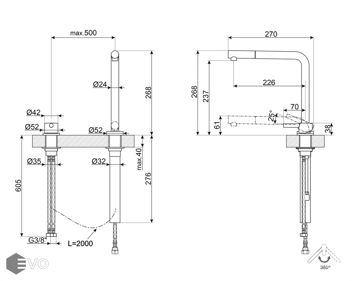• Дистанционный однорычажный вентиль (размещение не далее 50 см от излива)