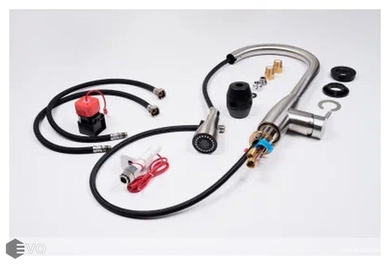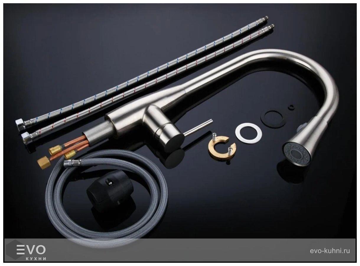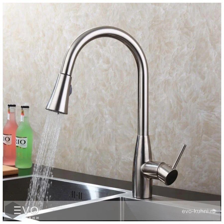 Смеситель для кухни (поверхность сатиновая) в мойку OL-8016. Смеситель с поворотным изливом и выносным душем. Данный кран имеет удобную ручку для плавного переключения воды и сенсор для подачи и остановки воды (реализовано две функции за подачей воды — механическая и сенсорная).