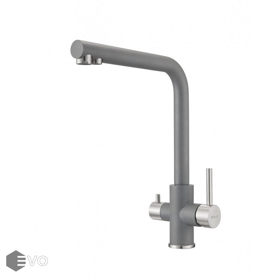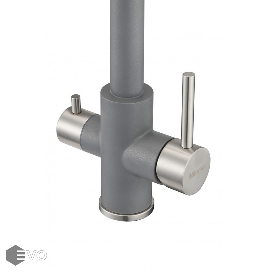 Смеситель для кухонной мойки Milacio Ultra (MCU.553.GR) из нержавеющей стали с нанесением лакокрасочного покрытия серого цвета с мелкими вкраплениями металлика, с возможностью подключения фильтра — стильное и инновационное решение для вашей кухни. Современный дизайн в сочетании с высочайшим качеством обеспечат изделию сохранение безупречного внешнего вида и функциональности на весь срок эксплуатации.